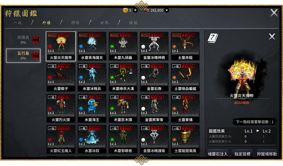 - 狩獵圖鑑 25 種,收錄各種受五行之力影響的獨特怪物。