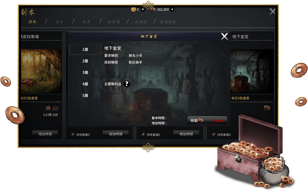 - 地下金宮為專門刷取銅錢的副本,擊殺該副本內怪物時僅能獲得銅錢,無法獲得其他道具和聲望經驗值。