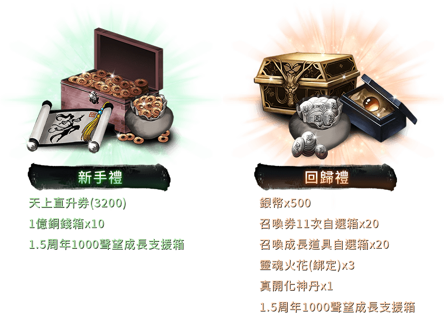 ※1.5週年1000聲望成長支援箱:「1.5週年1000聲望成長支援箱」是階段性成長支援道具,聲望達 1000 以上才可使用。使用後,可獲得 +6 強綁定無極裝備套裝、召喚券等豐富獎勵,並額外獲得活動期間限定稱號「此生無悔入天碑」(該稱號將於8/20維護後刪除)。