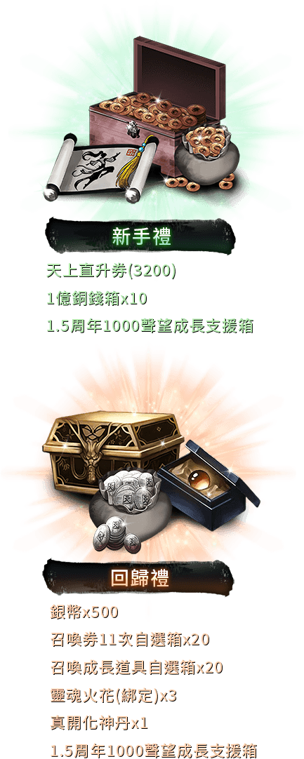 新手/回歸玩家(超過30日無登入紀錄)加入江湖,即可透過「限定禮包」,以極低的銅錢價格購買到豐富好禮。此外在活動期間內,回歸玩家還可額外參加專屬的7日簽到活動。