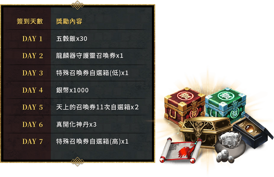 6/23後無登入紀錄的回歸玩家,在首次進入遊戲時可開啟「7日回歸簽到獎勵」。