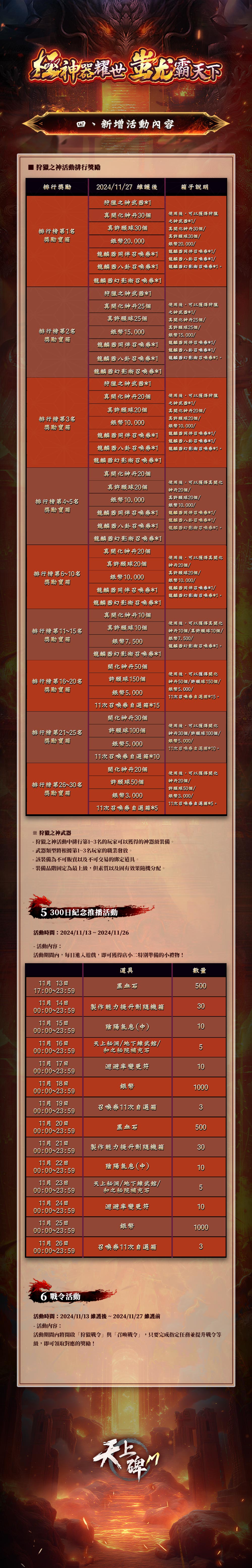 《天上碑M》已於2024/11/13(三) 17:00 伺服器改版更新完畢,少俠可以正常進入伺服器闖蕩江湖!