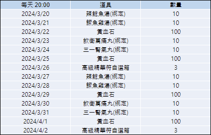 ※領取時間為: 每日20:00 ~ 22:00,將直接發送至角色郵件中