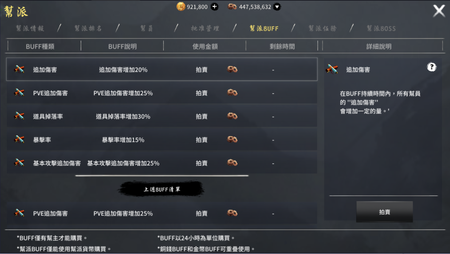 | - 幫派銅錢BUFF的競標與金幣BUFF相同,僅能透過幫主進行投標。 - 銅錢BUFF的競標在每週二00點~20點之間進行。 - 參與競標時,在競標結束前都可自由的取消競標。 - 銅錢BUFF每週會隨機出現5個,並且可競標的數量不限。 - 根據競標的結果,第1名的幫派可以獲得完整的BUFF效果。 - 參與了競標但沒有獲得第1名的幫派則會獲得部分BUFF效果。 - 銅錢BUFF是有時間限制的,並且會在下個競標結束後消失 |