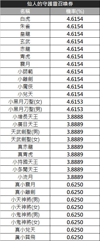 禮包內容:金幣100、幻影術11次召喚券1個、八卦11次召喚券1個、守護靈11次召喚券1個