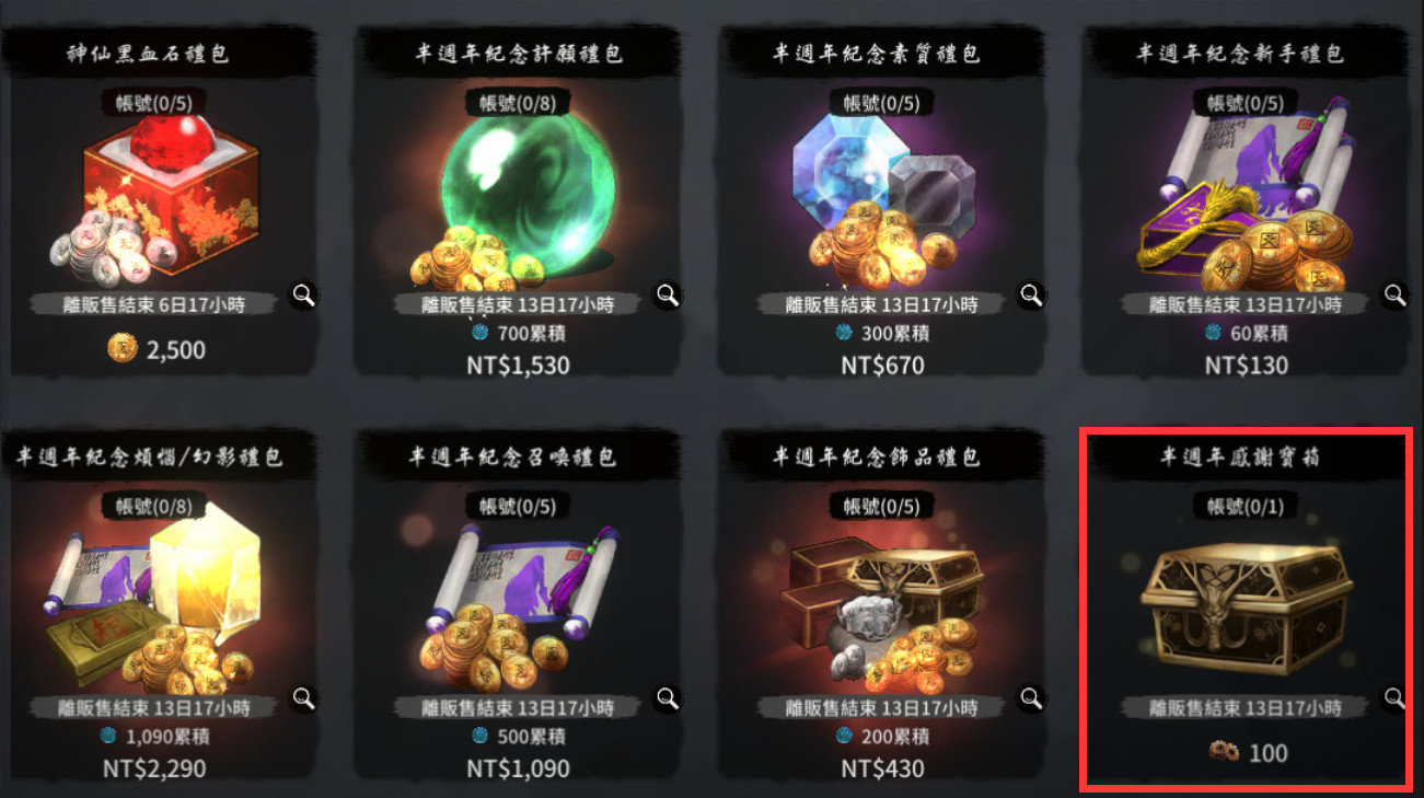 活動期間內,商城追加販賣「半週年感謝寶箱」,每個帳號限購1次,售價100銅錢。