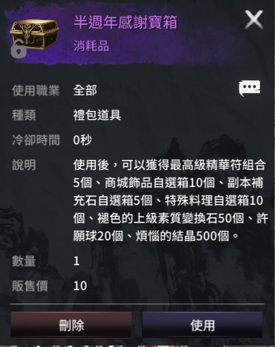 購買後,可透過半週年感謝寶箱獲得「最高級精華符組合*5、商城飾品自選箱*10、副本補充石自選箱*5、特殊料理自選箱*10、褪色的上級素質變換石*50、許願球*20、煩惱的結晶*500」。