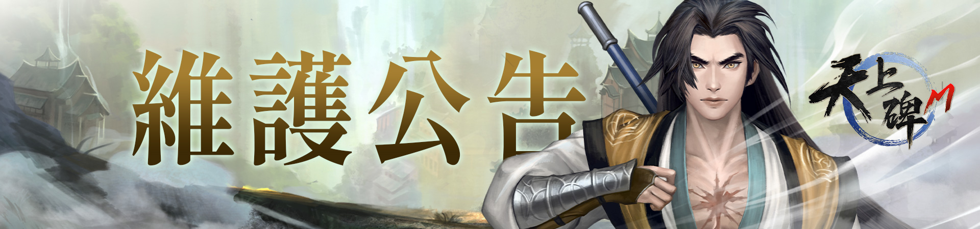 為了提供少俠們更豐富的體驗內容,《天上碑M》將於 2024/7/17(三) 9:00 ~ 13:00 進行伺服器維護更新,為保障您的資料安全,請您於更新前先行下線,謝謝您的支持與配合!