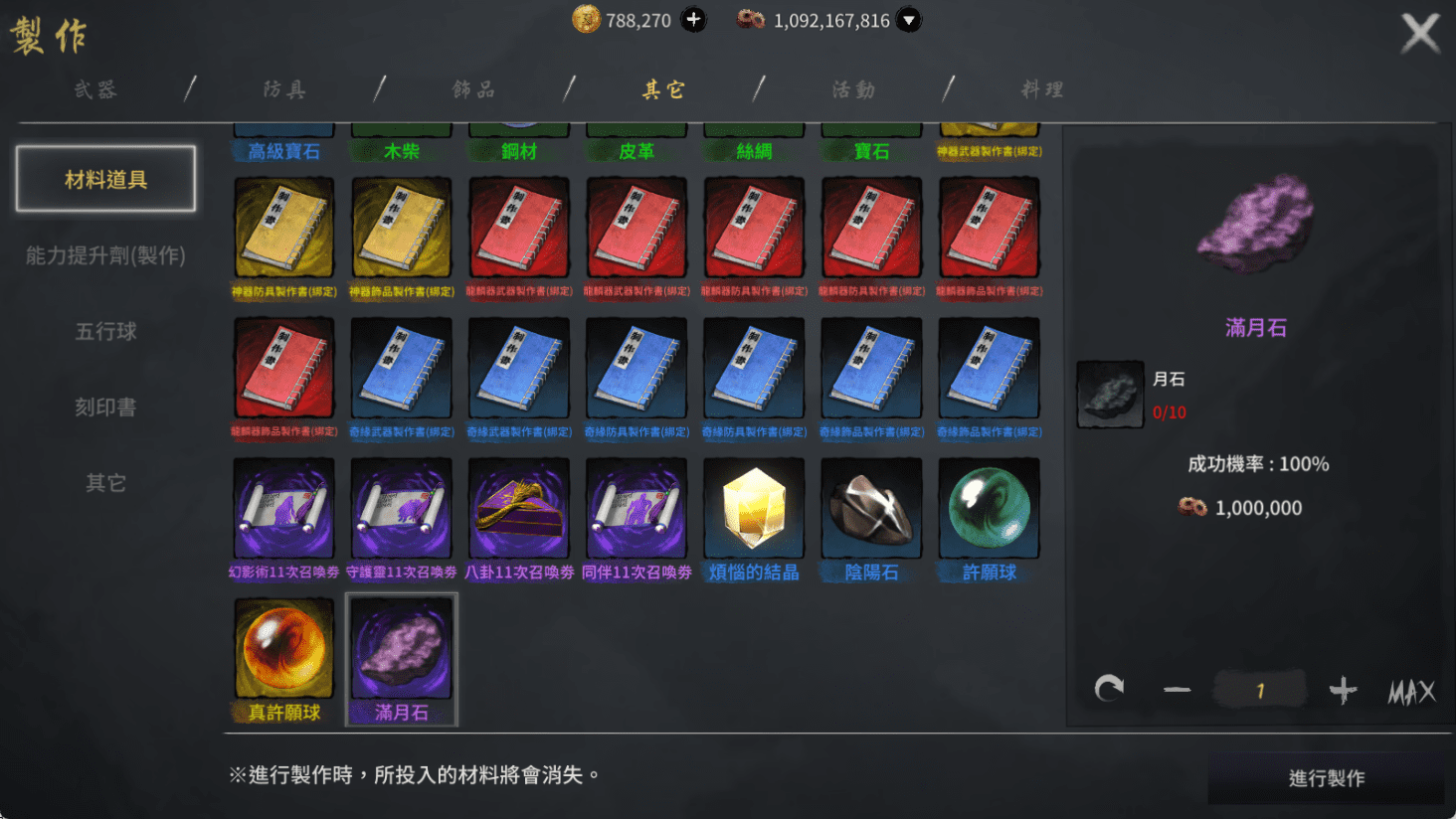 - 製作時會消耗月石以及銅錢作為材料。