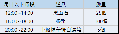禮包內容:金幣300、避邪/寶珠自選箱10個、滿月石100個、黑血石200個、銀幣500
