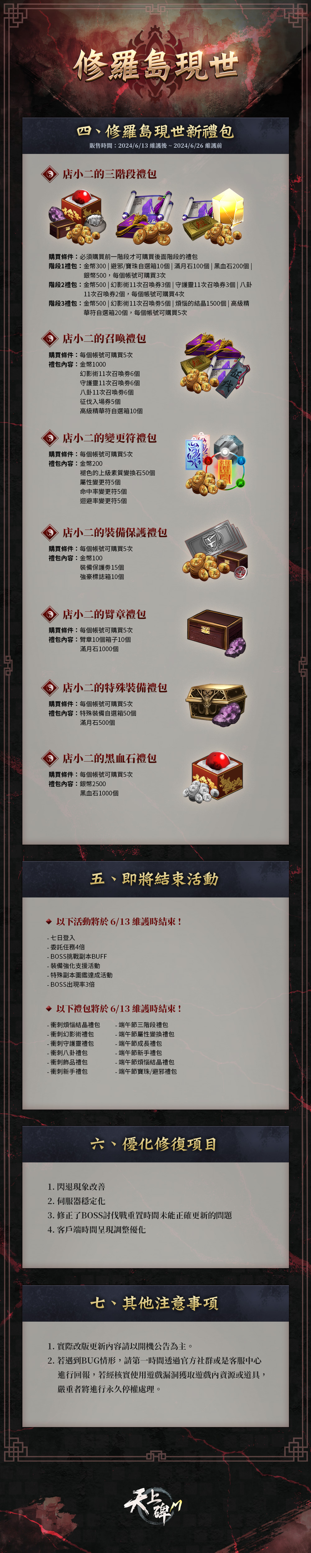 - 端午節粽子兌換商店活動將延長至6/26維護前。※粽葉以及糯米的掉落延長至6/26維護前,NPC流月開放至7/3維護前。