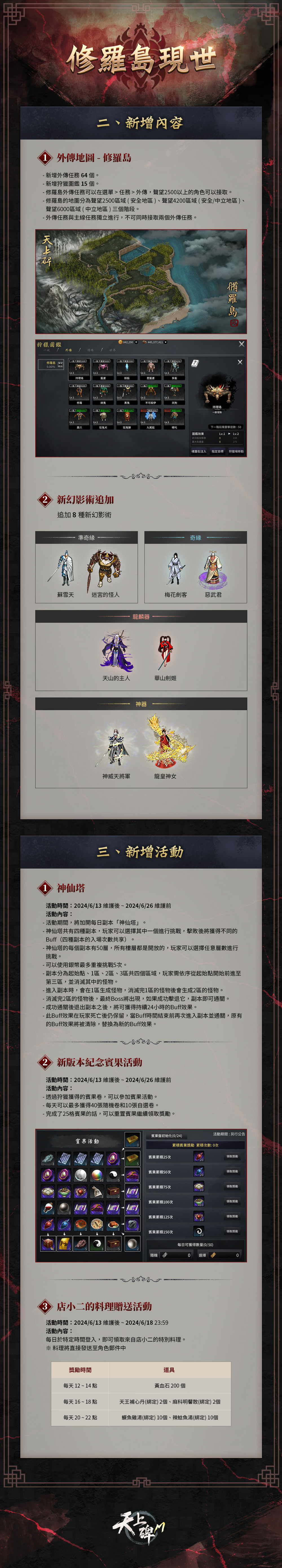 《天上碑M》已於2024/6/13(四) 14:30 伺服器維護更新完畢,少俠可以正常進入伺服器闖蕩江湖!