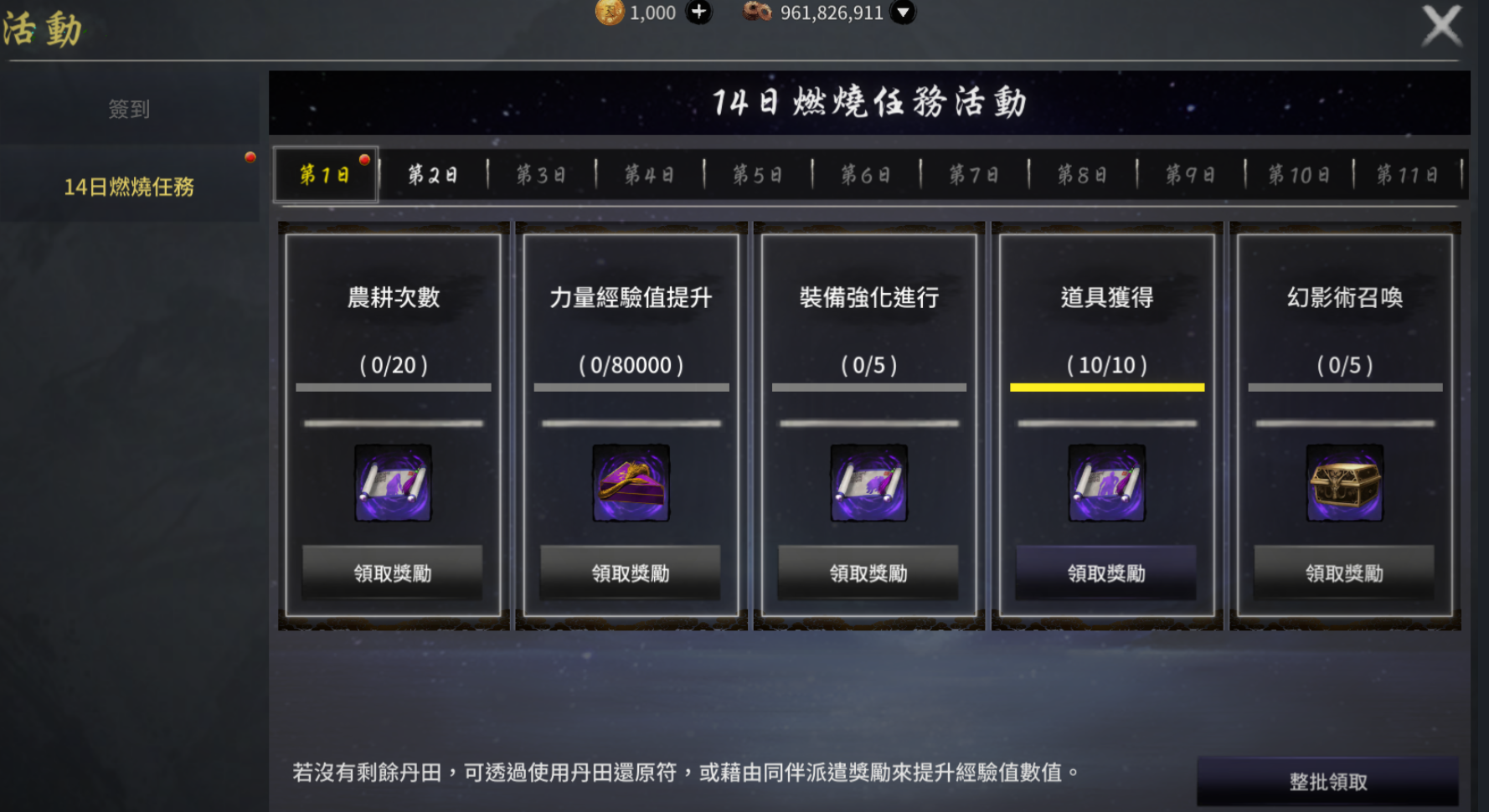 註:部分任務將要求玩家提升指定四維的經驗值。若角色已無剩餘丹田,將無法透過狩獵獲得經驗值。可透過道具「丹田還原符」重新獲得丹田,或進行對應的同伴派遣來獲得經驗值。