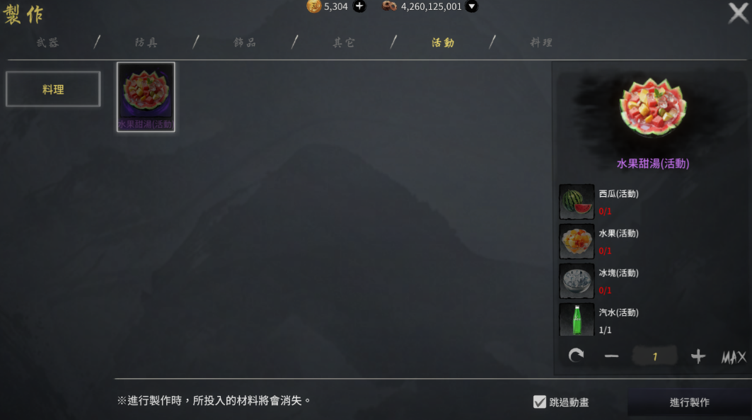 活動期間內,擊殺世界副本內的怪物可獲得製作水果甜湯(活動)所需的材料。在選單 > 製作 > 料理中,可將收集到的材料製作為活動Buff道具「水果甜湯(活動)」。