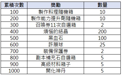活動期間內,「累積製作」或「累積成功製作」達一定次數,即可獲得對應獎勵。