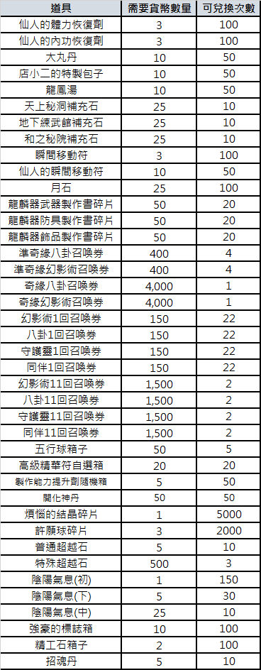 禮包內容:銀幣350個、夢幻的精華符自選箱100個、開化神丹1個、仙人體力恢復劑50個、仙人內功恢復劑50個、店小二特製包子40個、召喚券11次自選箱1個、龍鳳湯40個