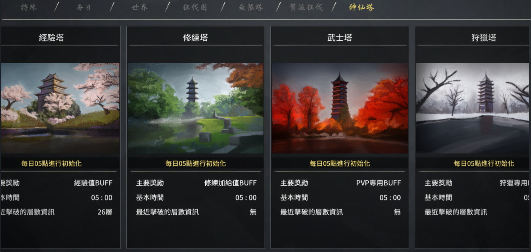 活動期間內,將開啟四種神仙塔副本,每種神仙塔副本皆有50層。玩家可選擇任一層數進行挑戰。挑戰成功後,將獲得24小時的Buff效果。