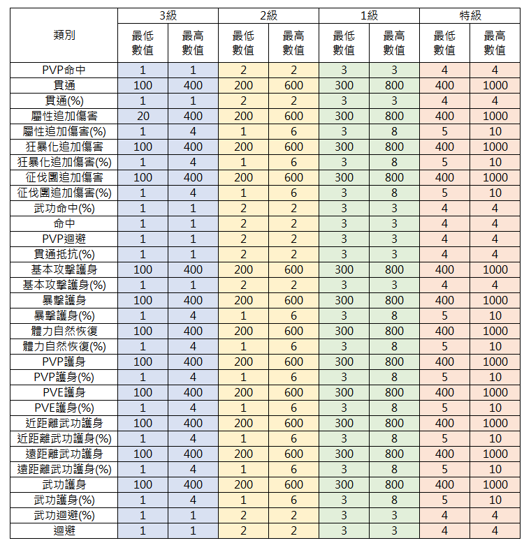 - 自明石:PVP命中、貫通、貫通(%)、屬性追加傷害、屬性追加傷害(%)、狂暴化追加傷害、狂暴化追加傷害(%)、征伐團追加傷害、征伐團追加傷害(%)、武功命中(%)、命中