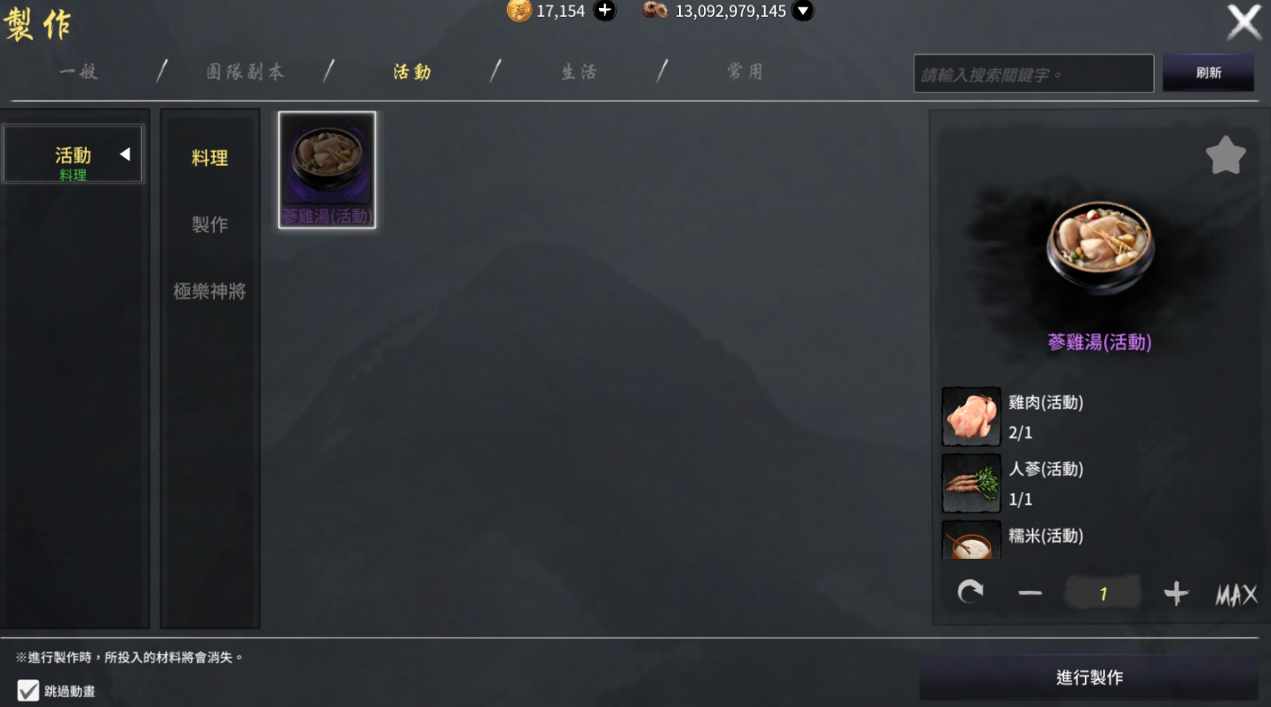 ※蔘雞湯(活動)無法和其他活動料理道具同時使用。