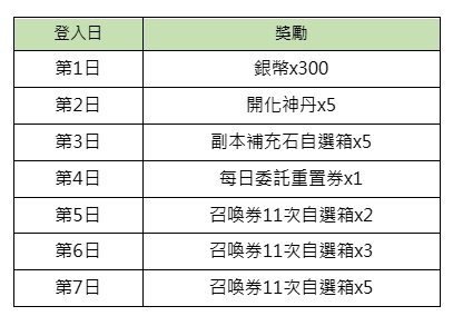 禮包內容:銀幣 1500個、每日委託重置券 3個、地區捐獻追加券 10個、開化神丹 70個、真開化神丹 2個