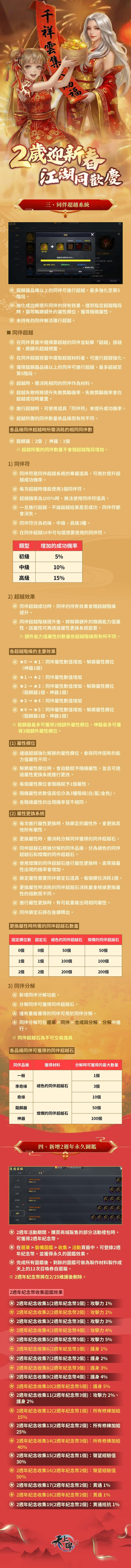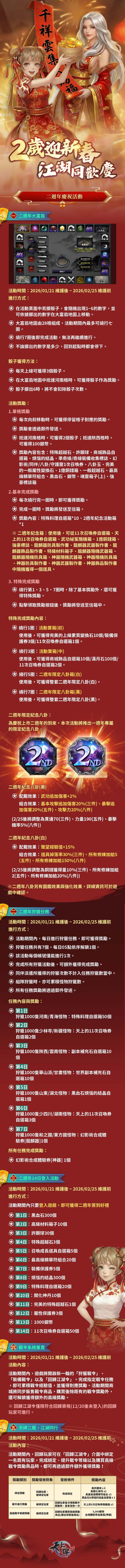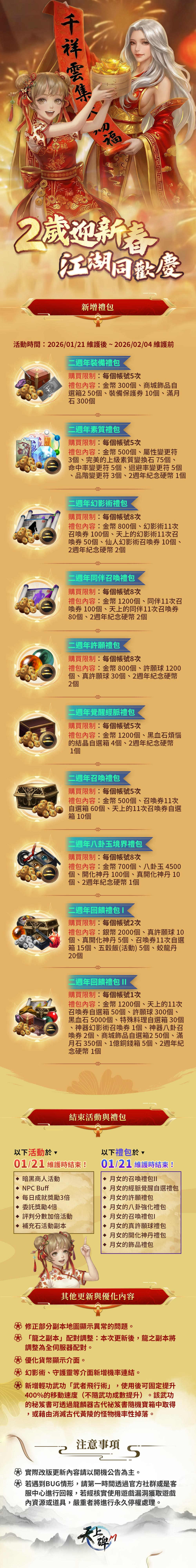 5.經營運團隊確認,本次維護更新的公告中,「二週年回饋禮包 II」的內容物「2週年紀念硬幣」數量誤植為2個。購買該禮包後,實際獲得的正確數量應為1個。針對01/25(日) 23:59前購買該商品的玩家,營運團隊已於01/26統一補發1個「2週年紀念硬幣」作為補償。01/26後購買該商品的玩家,將僅會獲得一個2週年紀念硬幣,不會額外獲得補償。