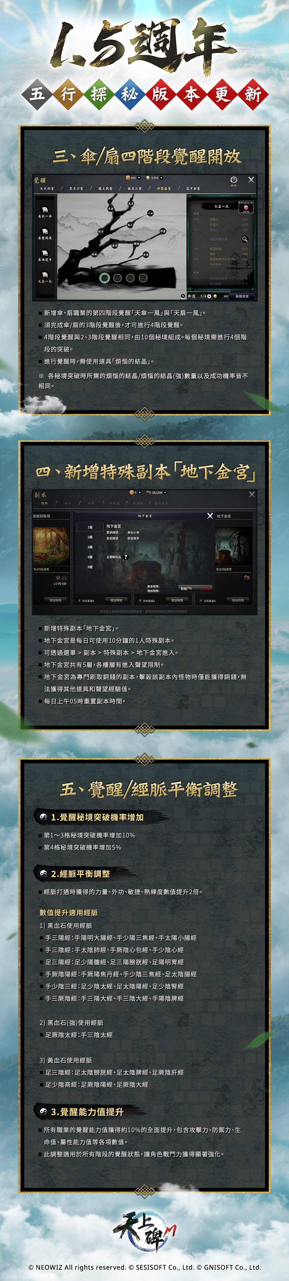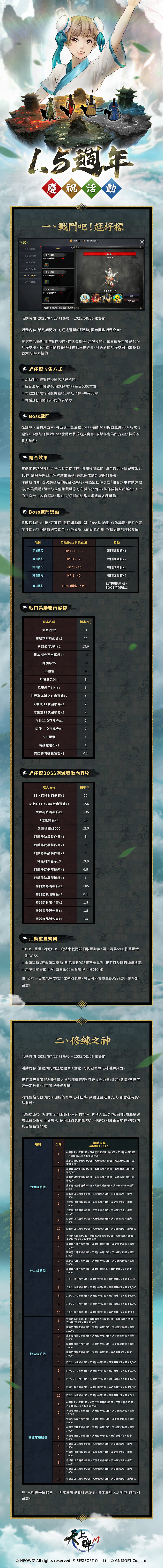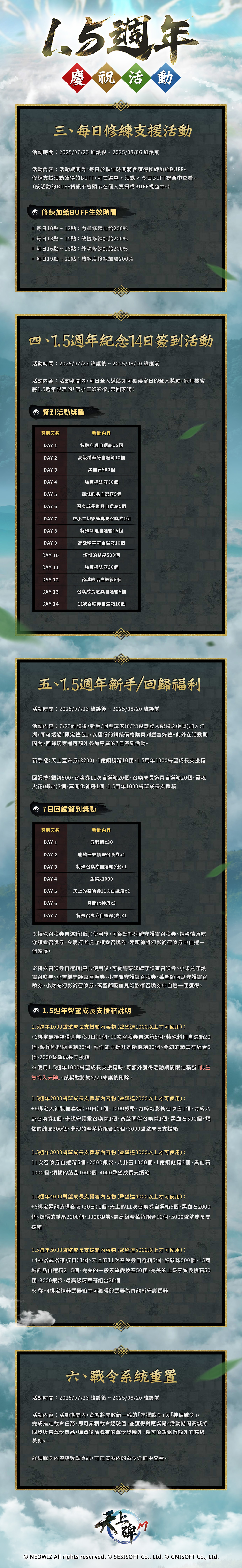 《天上碑M》已於 2025/07/23(三) 09:00 ~ 17:00 伺服器改版更新完畢,少俠可以正常進入伺服器闖蕩江湖!