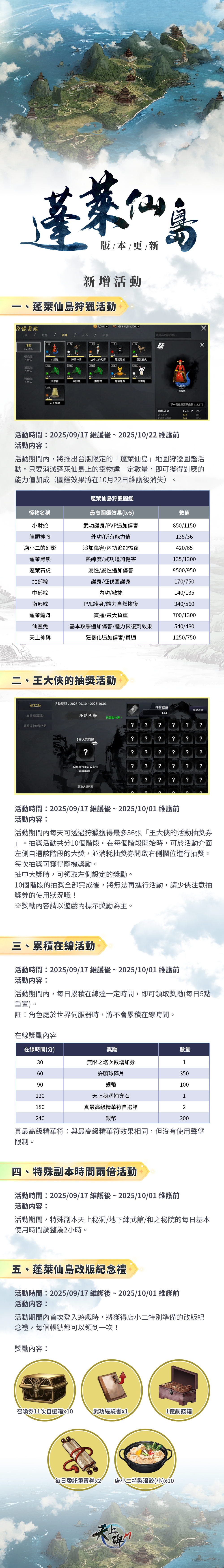《天上碑M》已於 2025/09/17(三) 09:00 ~ 16:00 伺服器改版更新完畢,少俠可以正常進入伺服器闖蕩江湖!