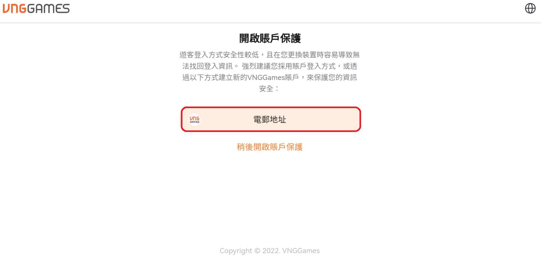 後續登入遊戲時,請選擇【電郵地址或手機號】登入。也可參考「恢復遊客帳號」說明。