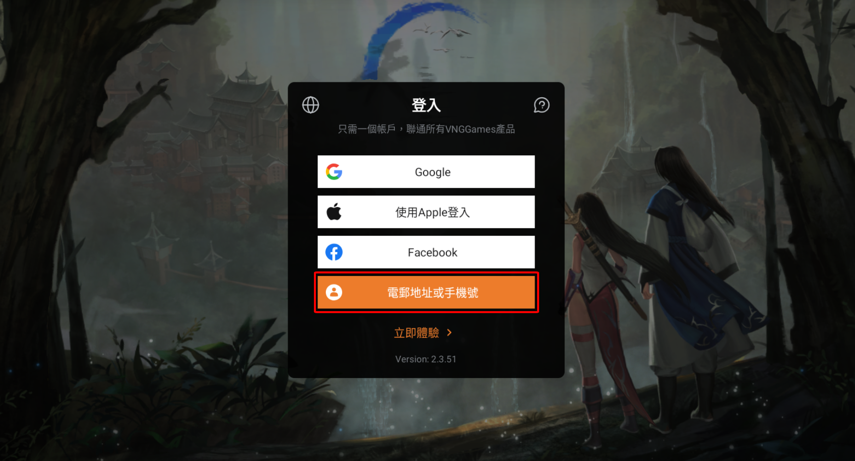 1.進入遊戲後,點選登入畫面的【電郵地址或手機號】操作登入。