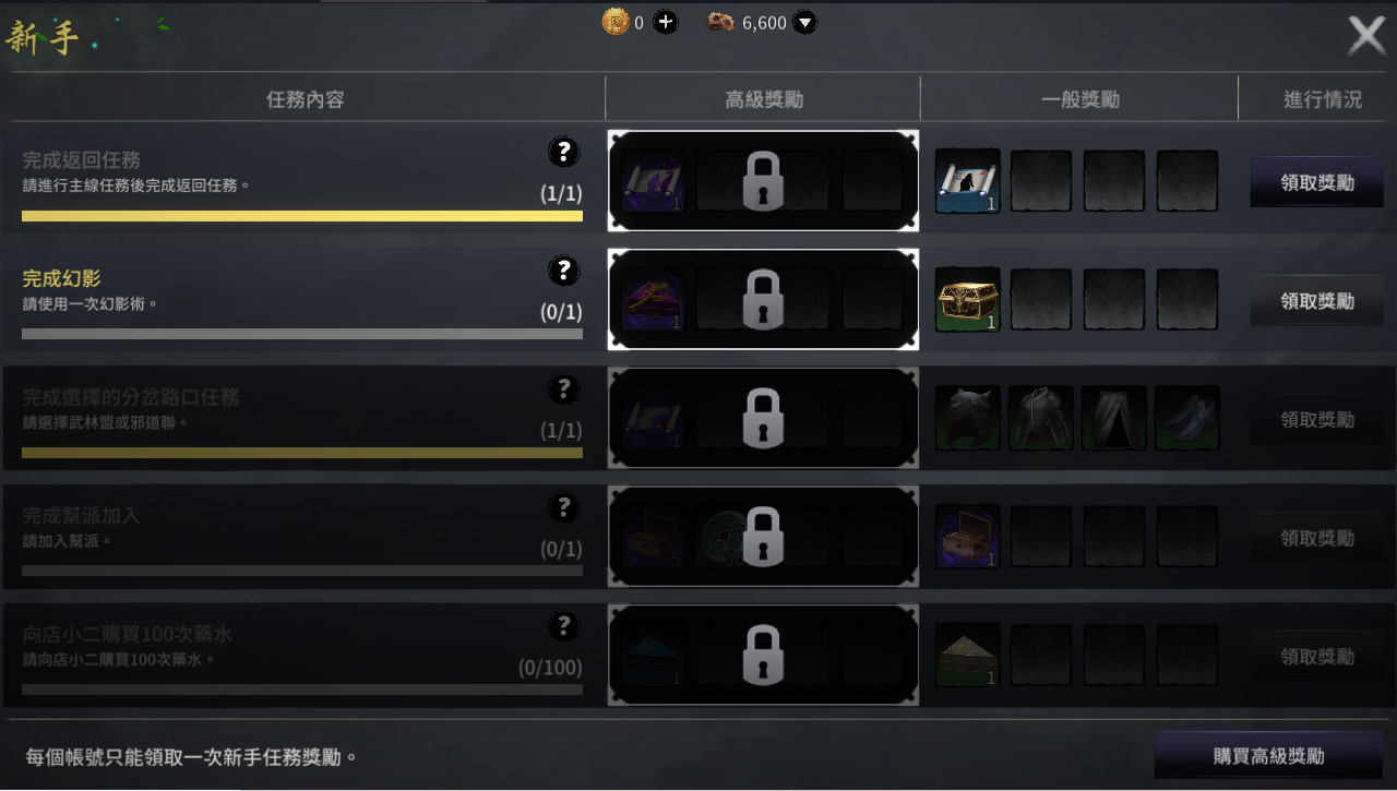 - 若於新手任務全部完成後購買高級獎勵,獎勵將直接進入郵件箱。