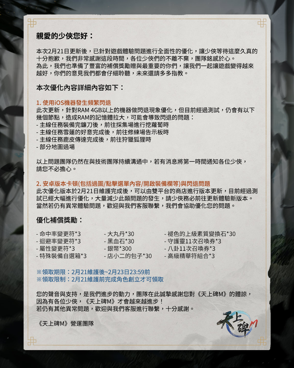 此次維護完成後,若您仍發現遊戲中有禮包未更新/地圖未更新等異常,請刪除包體後再重新至商店下載或是至官方網站下載專用APK進行更新。