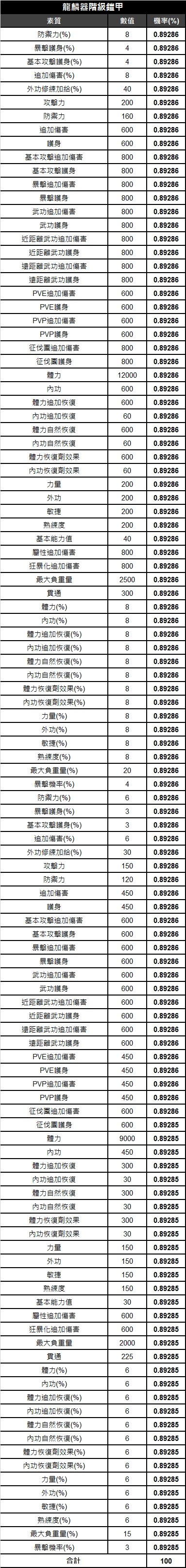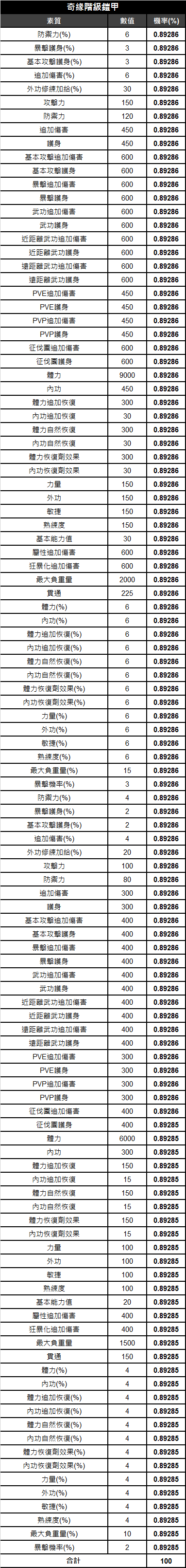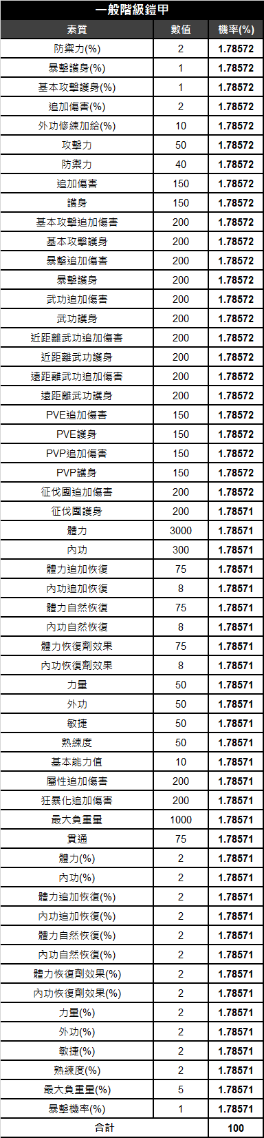 《天上碑M》鎧甲素質相關機率表