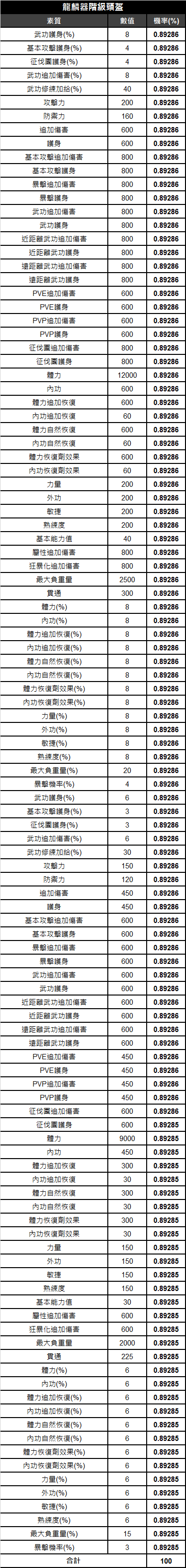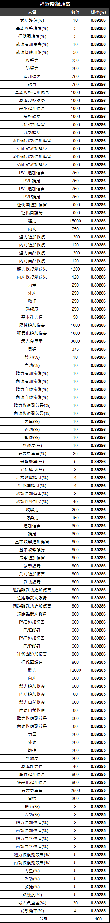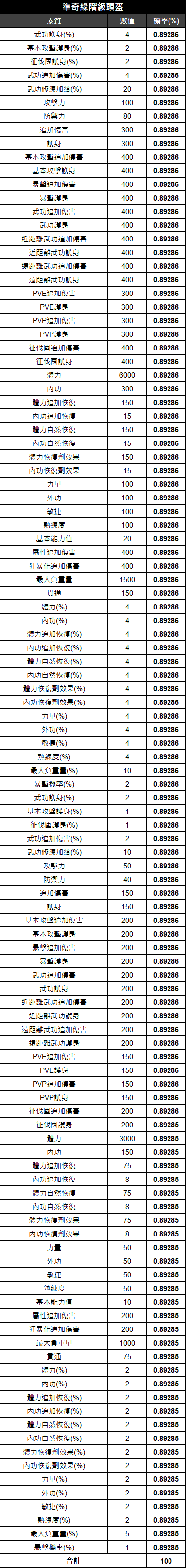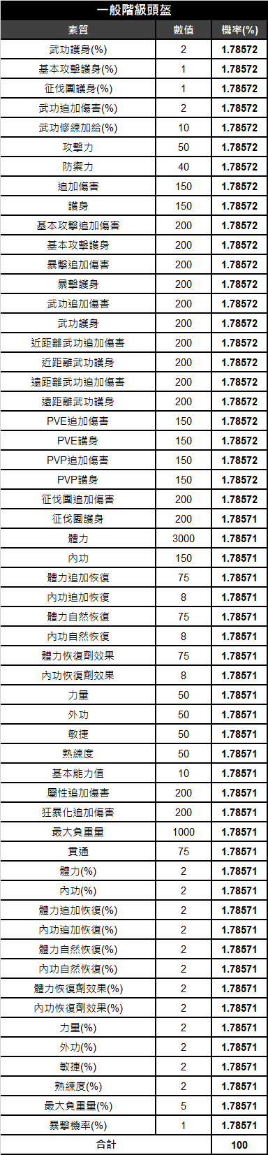 《天上碑M》頭盔素質相關機率表