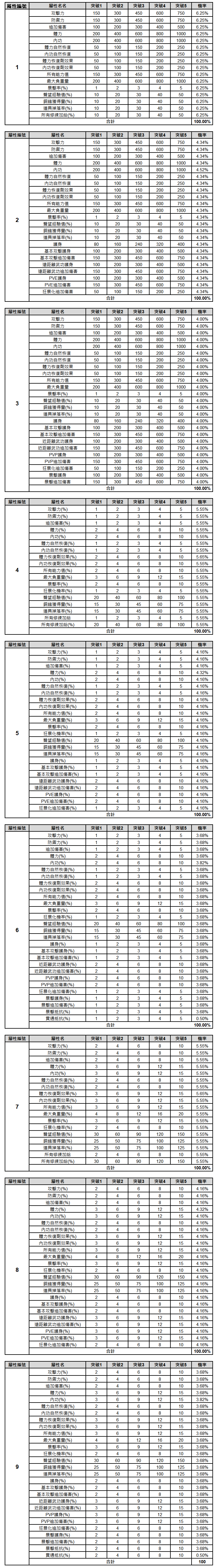 《天上碑M》守護靈分解/突破相關機率表